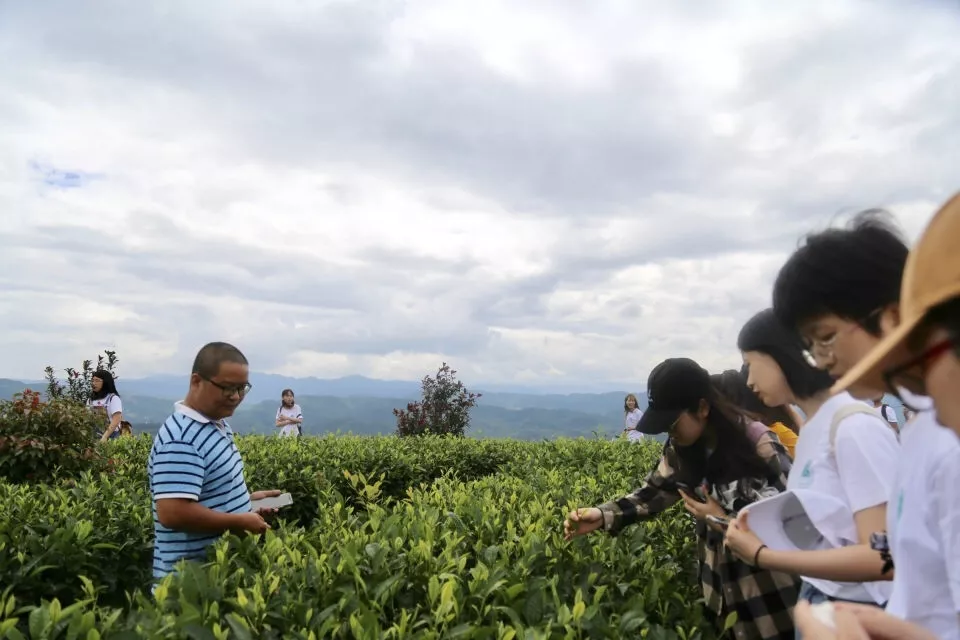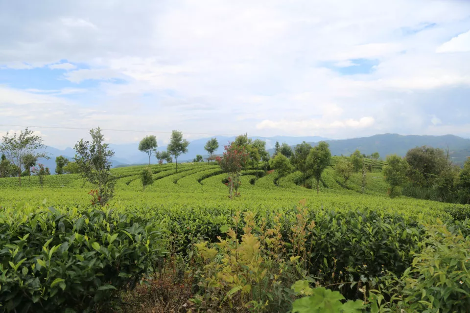 下午启程沿着旅游环线上盘山公路,来到竜巴万亩生态茶园,沟壑纵横、丘坪交错,昔日老百姓苦不堪言的“望天田”,摇身变成层层梯田式茶园,成为竜巴村主要的产茶区。