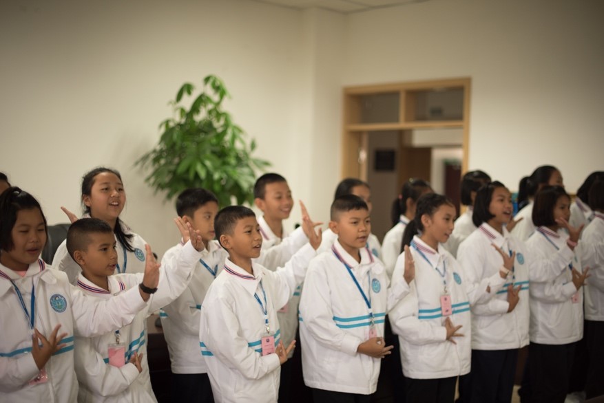 泰国青少年善行友好使者基金会代表团的三十多名小学生通过朗诵诗歌和合唱的方式展示了善行使者基金会的宗旨以及与东盟成员国齐心协力发扬善行的意愿。
