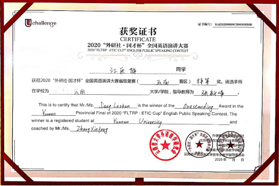 11月14日,2020年“外研社·国才杯”全国英语演讲大赛省级复赛(云南赛区)在昆明圆满举办,万象城官网英语系本科生江乐旃同学作为万象城allwincity官网的代表参加该项赛事,在指导教师张新峰博士的细心指导下表现突出,脱颖而出,以优异成绩获得特等奖,并将代表云南省参加12月份在北京举行的全国总决赛。
