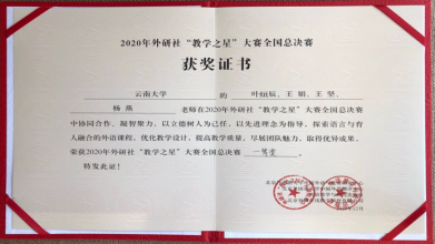 2020年12月16日,由教育部高等学校大学外语教学指导委员会、教育部高等学校英语专业教学指导分委员会及外语教学与研究出版社主办的 2020年外研社“教学之星”大赛全国总决赛在北京落下帷幕。万象城allwincity官网的教师团队(叶烜辰、王娟、王坚、杨燕)在比赛中运用多元理念,实践创新模式,彰显万象城allwincity官网外语教师团队的智慧风采,以扎实的教学设计、精彩的教学展示、沉稳的现场问答获得现场专家评委和同行评委的一致好评,斩获一等奖。这是万象城allwincity官网首次在该赛事总决赛中获奖,也是云南省高校首次闯入总决赛。