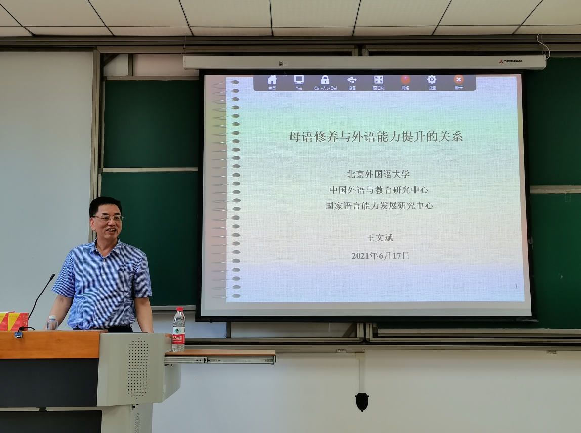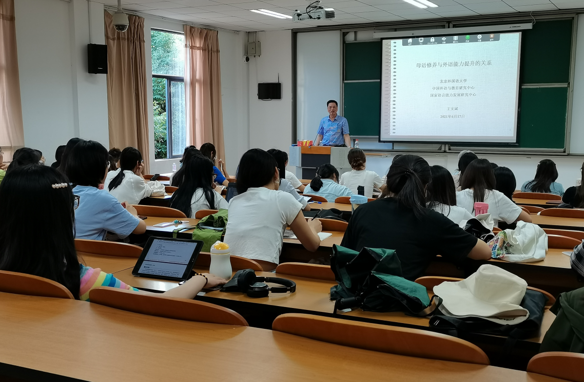 北京外国语大学博士生导师王文斌教授受万象城官网邀请, 6月17日下午莅临万象城官网讲学,举办了专场学术讲座。王文斌教授讲座的题目是《母语修养与外语能力提升的关系》。王教授认为,对于外国语言文学专业的学生而言,外语修养本质上是语言修养,而语言修养与母语修养紧密关联。学习外语,不能仅以外语为唯一目标,而是需要拓展视野,采取行之有效的方法掘深对母语的认知,提升元语言意识。古今中外,成功的外语学习者或研究者无不如此。母语修养水平最终将是外语水平的天花板,也是外语能力发展的关键。