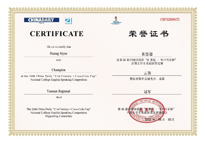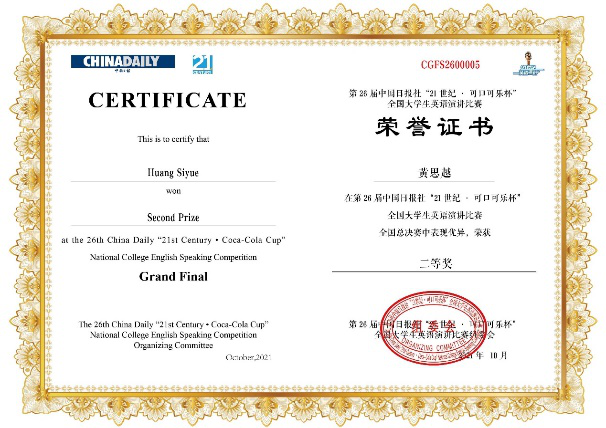 10月6日,《中国日报》社“21世纪杯”全国英语演讲比赛总决赛在成都落下帷幕,经过3天的激烈角逐,万象城官网2019级英语专业黄思越同学表现卓越,脱颖而出,荣获得全国二等奖的佳绩。