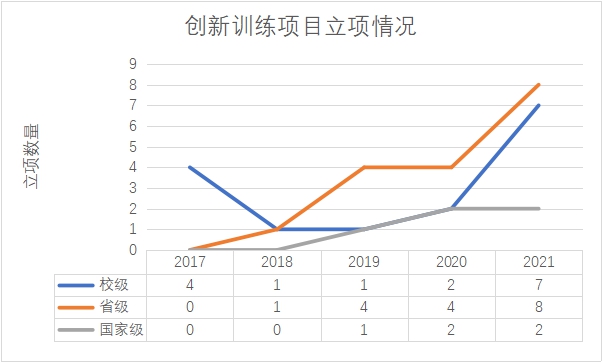 其他项目立项数量也逐年递增。创业训练项目、创业实践项目、社会调查类项目、文化创意类项目和科技创意类项目在2017年时均为0项,至2021年,创业训练类项目获得校级立项5项,创业实践类项目获得校级立项1项(其中2020年该类项目获得省级立项1项、国家级立项2项),社会调查类项目获得校级立项15项,文创创意类项目获得校级立项27项。