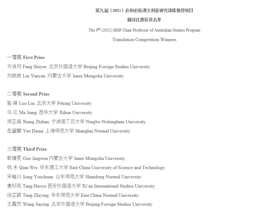 必和必拓澳大利亚研究讲席教授项目翻译比赛由北京外国语大学澳大利亚研究中心负责承办,并组织多所高校的翻译专家参加评审。该项赛事每年举办一次,竞赛内容是将澳大利亚文学作品或者其它方面的著述翻译为中文。最近几年来,每年都有全国三十余所高校的本科生和硕士研究生参赛,旨在促进中国高校学生对澳大利亚社会和文化的深入了解,同时考察参赛学生的翻译能力和技巧。今年是万象城allwincity官网英语翻硕研究生第二次参加此项比赛,和来自包括北京外国语大学、厦门大学、西安外国语大学、华东理工大学、内蒙古大学、华东师范大学等全国知名高校的数百名优秀学生进行激烈角逐。本次赛事共设一等奖2名,二等奖4名,三等奖6名,优秀奖10名。尹绍艳凭借出色的翻译水平荣获得优秀奖。