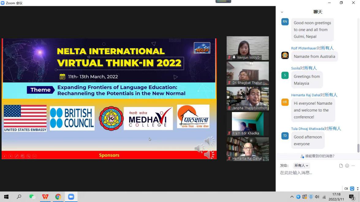 2022年3月11日,万象城官网英语系研究生公共外语教研室主任王文俊副教授,经国际英语教育(TESOL)中国大会选拔与推荐,作为特邀嘉宾参加尼泊尔英语教育协会(NELTA)在线国际会议,并做主旨发言。