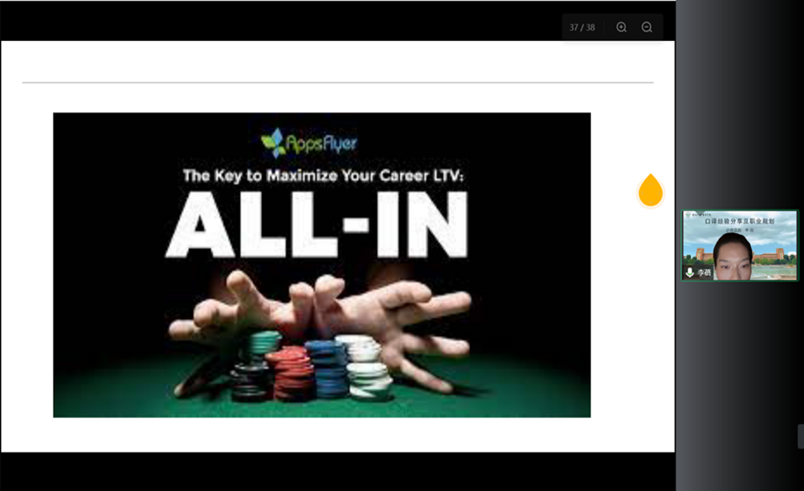 接着,她从自身经历出发分享了口译历程,展示了在上海华尔道夫酒店、上海经贸大厦等多地做口译时的照片。她告诉大家做口译的好处是一入行就能开阔眼界,人们常说“读万卷书,行万里路”,做口译会让大家不得不行万里路,于是便在无形中增长了见识。由于工作的难度与强度,口译工作的薪酬通常更高,同时,在积累一定的行业名声后,客户也相对稳定。因此,对比语言学习者通常从事的其他职业,如教师、外贸等,口译工作能提供给从业者更多的选择和自由。