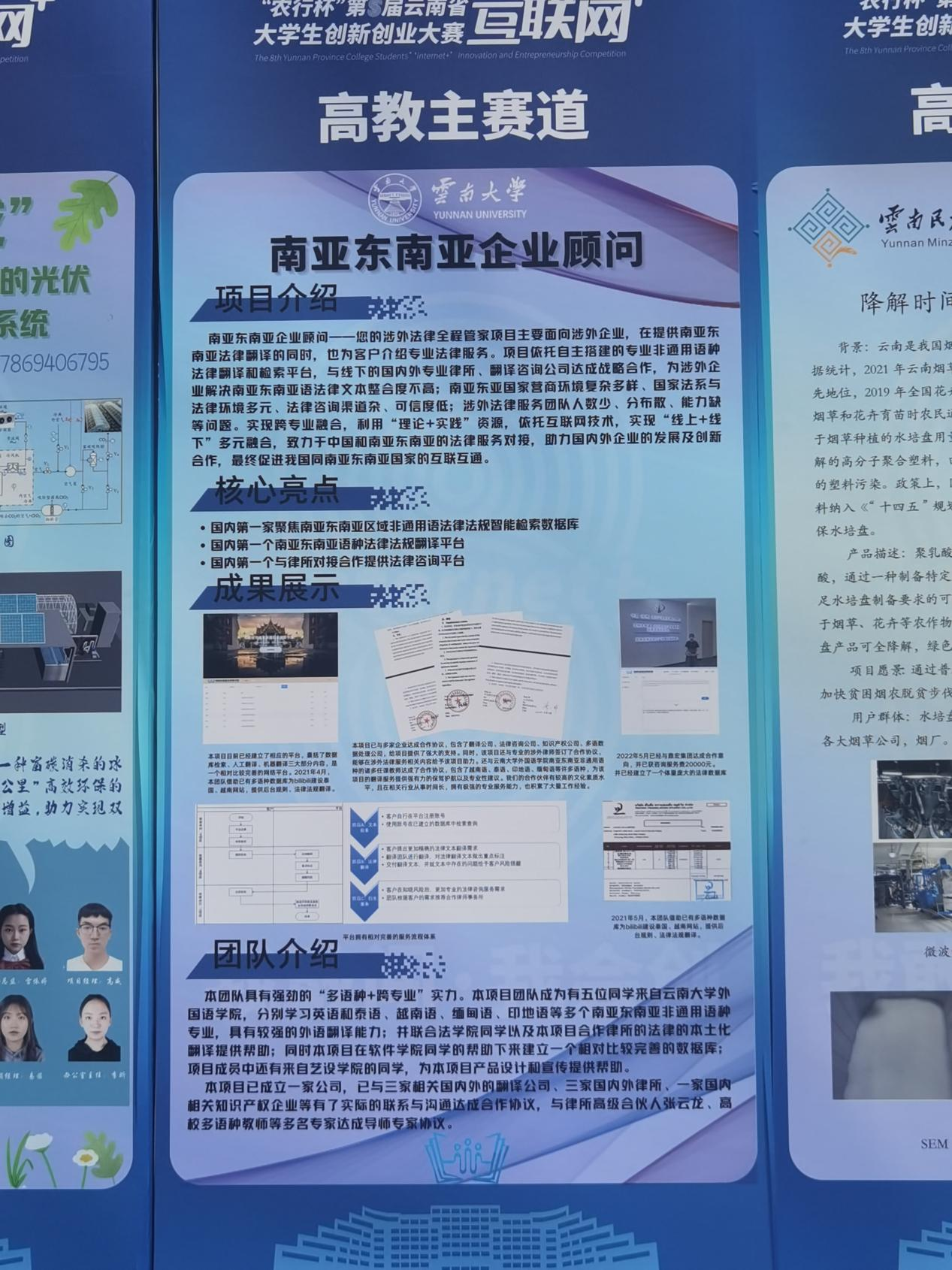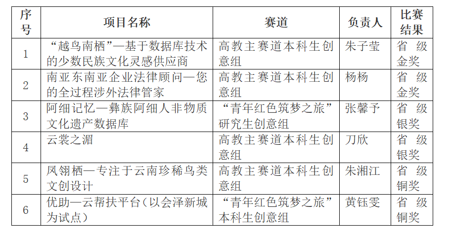 进入7月的省内评审阶段,万象城官网6个晋级省赛的项目均顺利通过省内初审。其中高教主赛道的《“越鸟南栖”—基于数据库技术的少数民族文化灵感供应商》、《南亚东南亚企业法律顾问—您的全过程涉外法律管家》项目和“青年红色筑梦之旅”赛道的《阿细记忆—彝族阿细人非物质文化遗产数据库》项目入围省级金奖争夺赛现场路演决赛。