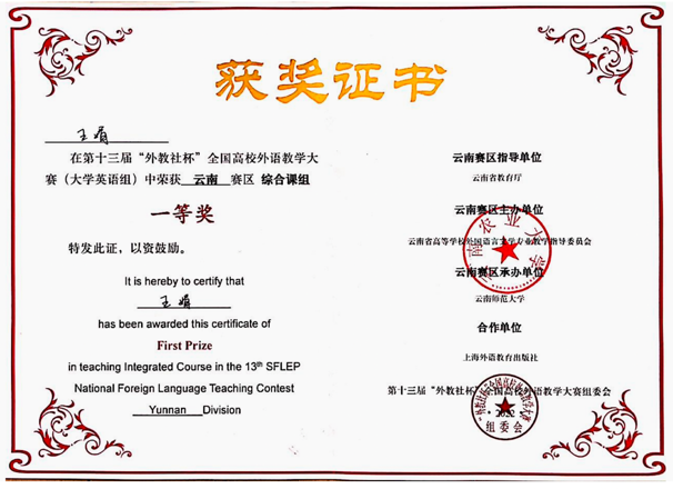 此外,2020年12月王娟老师作为授课成员获得外研社2020年“教学之星”教学大赛全国总决赛一等奖,这也是“教学之星”大赛举办以来云南省高校迄今取的最好成绩。2020年9月王娟老师在团队成员中排名第二,获得全国高校教师教学创新大赛-第六届外语微课大赛省级二等奖。2022年6月王娟老师还获得万象城allwincity官网第十六届教师课堂教学比赛一等奖。