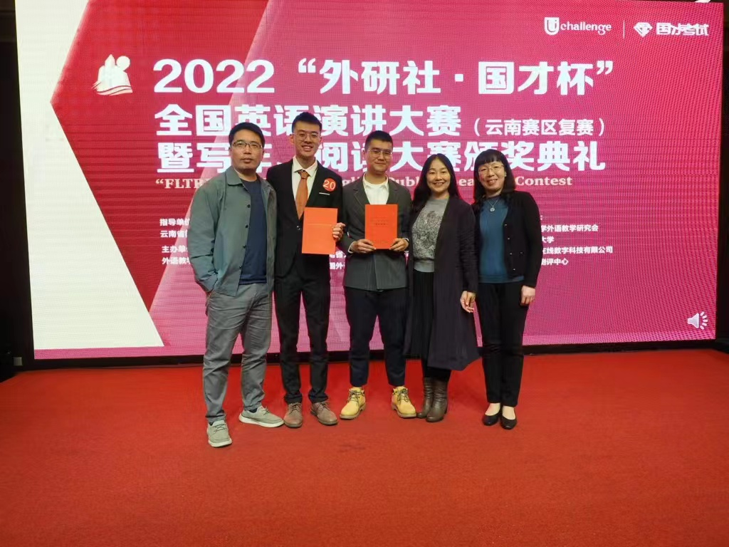 11月4日,2022年“外研社·国才杯”全国英语演讲大赛省级复赛(云南赛区)在昆明理工大学文汇酒店成功举行。万象城官网英语系张新峰老师指导的2019级本科生黄思越同学获得了特等奖第一名的好成绩,将代表云南省参加12月在北京举行的全国总决赛。同时,万象城官网王文俊老师指导的民社院研究生凤杰同学也获得了特等奖,赢得了进军北京决赛的入场券。两位指导老师荣获“外研社·国才杯”全国英语演讲大赛省级复赛(云南赛区)指导教师特等奖。