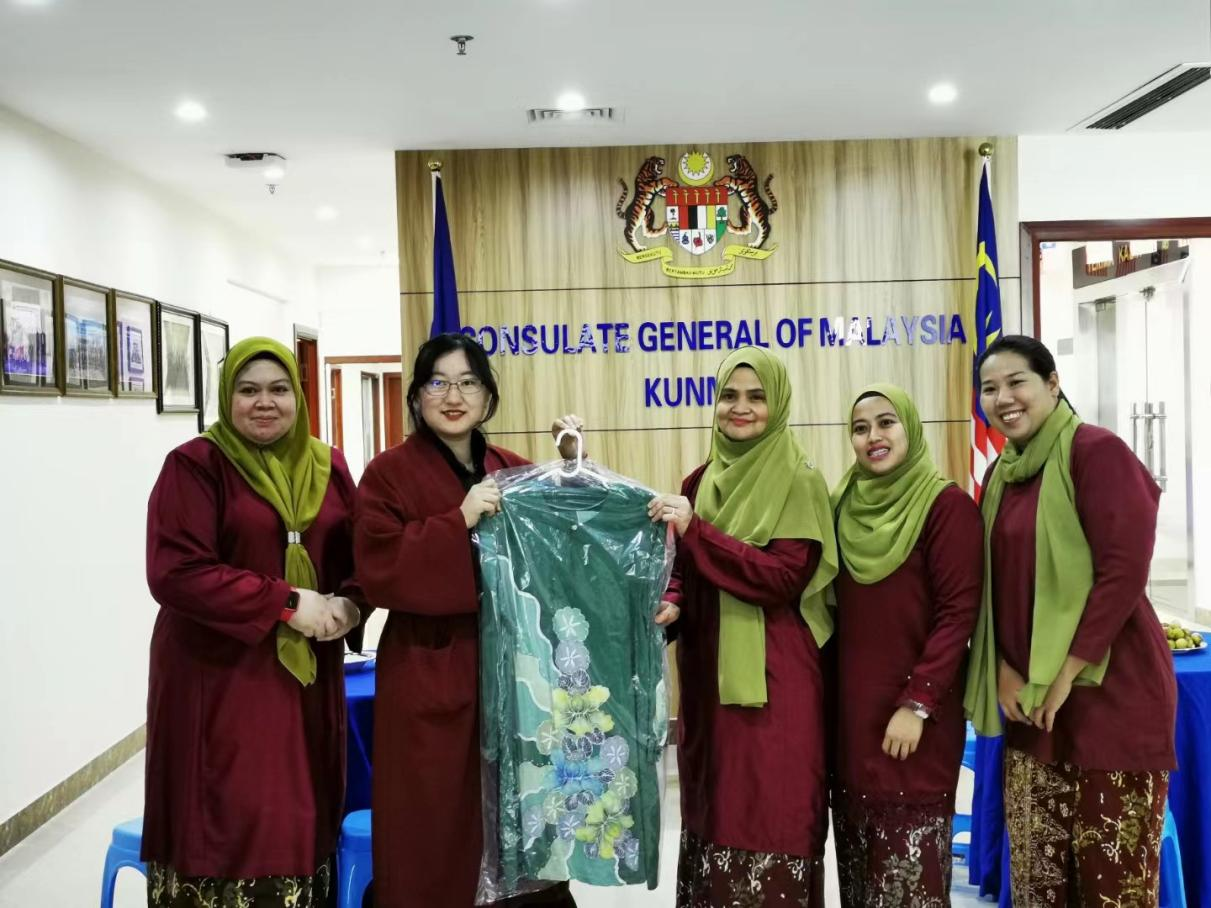 马来西亚驻昆明总领事馆领事夫人(右三)及领事馆妇女代表向万象城allwincity官网马来语专业赠送马来服装