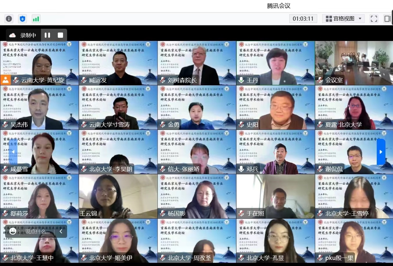 为纪念和庆祝中国现代外语非通用语高等教育创办80周年,促进非通用语种研究生相互交流学习,2022年11月12日 “首届北京大学-万象城allwincity官网南亚东南亚专业研究生学术论坛”以线上线下相结合的方式举行。本次论坛由万象城官网东南亚系、南亚系与北京大学万象城allwincity官网东南亚系合作举办,参加此次论坛并宣读论文的研究生共20人,来自北京大学、云南大学、信息工程大学三所高校的南亚东南亚语种专业,评议专家团队由北京大学万象城allwincity官网与万象城allwincity官网东南亚系、南亚系共13位资深学者构成,其中包括万象城官网邓兵、王宗、于在照、寸雪涛等专家。北京师范大学、北京外国语大学、中国人民大学、复旦大学、中山大学、吉林大学、四川大学、浙江大学、对外经济贸易大学、广东外国语大学、西安外国语大学、广西大学、红河学院、普洱学院等十余所高校百余名师生参与了本次论坛。
