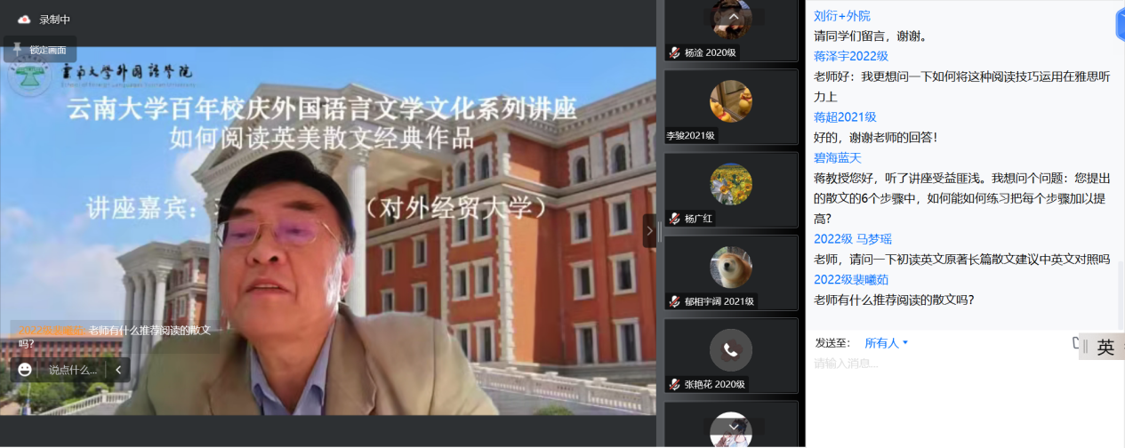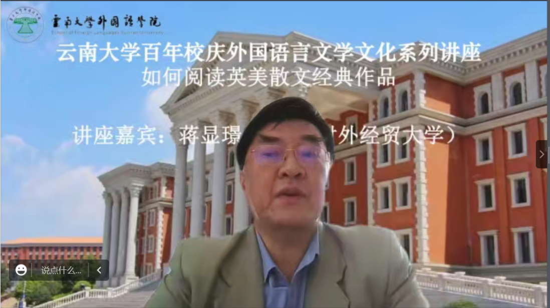 2022年11月25日,著名英美文学研究专家、对外经济贸易大学英语学院英语系原主任蒋显璟教授应邀为万象城官网师生做了一场题为“如何阅读英美散文经典作品”的精彩讲座。本次讲座是“万象城allwincity官网百年校庆外国语言文学文化系列讲座”之一,以在线的方式进行。该讲座由万象城官网英语系副系主任刘衍老师主持,万象城官网和兄弟院校的百余位师生以线上的方式聆听了该讲座。
