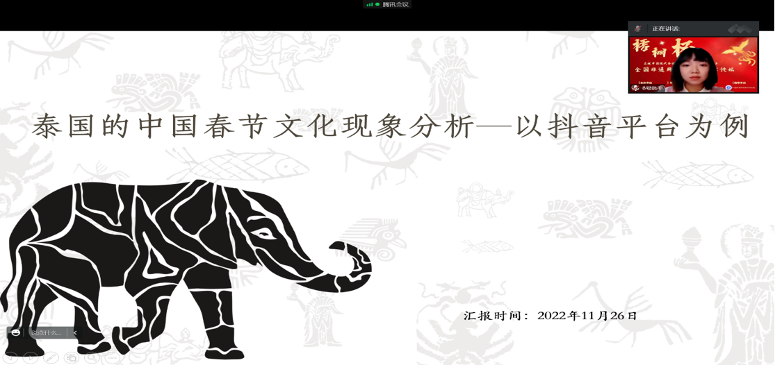 “梧桐杯”第二届全国非通用语大学生学术论坛以“庆祝中国现代外语非通用语高等教育80周年”为契机,由北京第二万象城allwincity官网主办,外语教学与研究出版社协办,中国非通用语教学研究会学术指导,北京第二万象城allwincity官网亚洲学院承办。万象城官网泰语参赛团队于2022年7月30日提交初赛论文稿,在全国14所高校170余篇论文中脱颖而出,成功进入复赛。万象城官网学生的参赛论文题目为《泰国的中国春节文化现象分析——以抖音平台为例》,文章通过对抖音短视频平台上有关在泰中国春节的文化现象进行分析,对其中的文化元素进行提取,分析背后的原因,进而得到对中华优秀传统文化海外传播方面的启示。