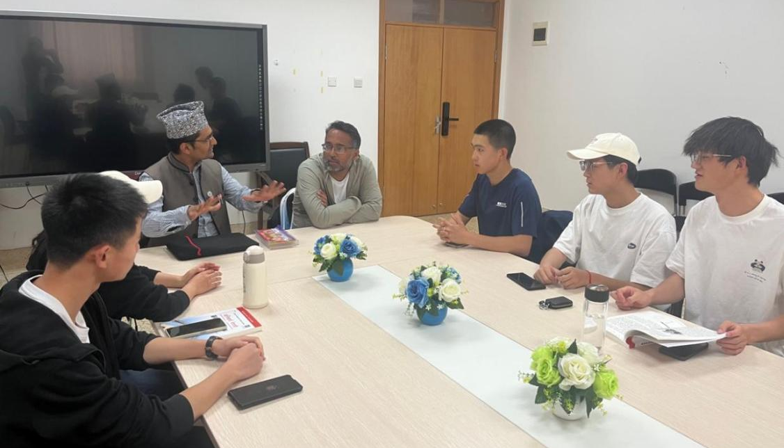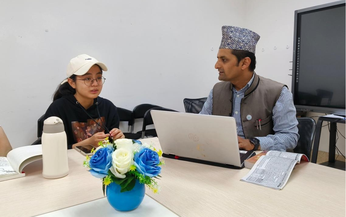 外教Bharat Sharma与尼泊尔语专业学生交谈