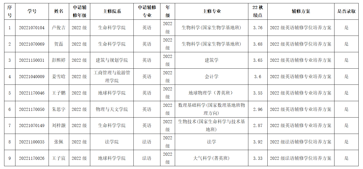 根据学校《关于做好2023年春季学期辅修申请工作的通知》相关规定,现将拟接收辅修的学生名单进行公示,详情如下: