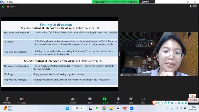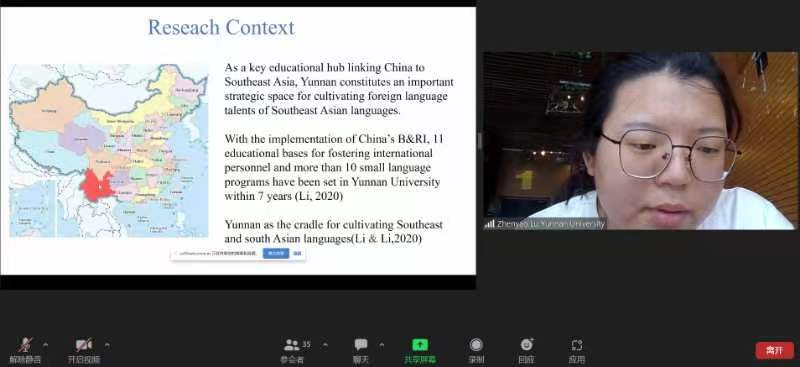 两位同学通过线上参会方式与全球学者分享多语研究成果。罗梦怡同学的研究以越南语专业学生为研究对象,采用语言社会化理论探讨越南语学习过程中的动态复杂特征;陆振瑶同学通过中越边境壮族村落收集到的民族志数据,采用应急语言学理论探讨少数民族聚集地语言服务话题。两位同学的研究话题来自于我国西南边疆地区日常语言生活实践,采用社会语言学前沿理论,探讨个体语言使用特征与社会文化生活之间的互动关系。