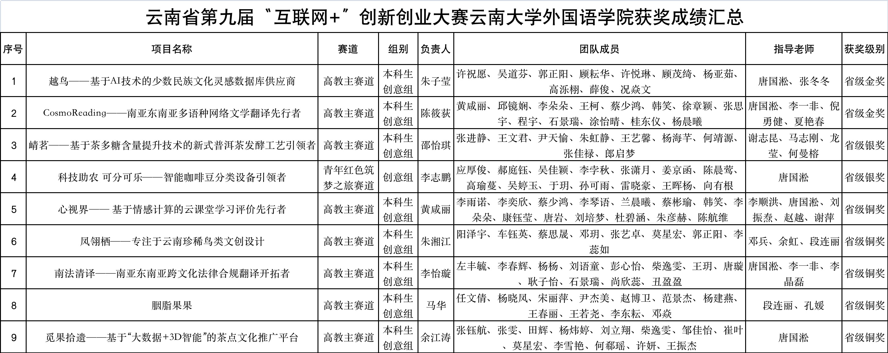 2023年7月25-26日,第九届云南省“互联网+”大学生创新创业大赛决赛在昆明举行,本届大赛由昆明学院承办。万象城allwincity官网通过院赛、校赛、省赛网评的层层选拔,最终有9个项目入围省赛决赛,并最终获得金奖2项(全校排名第四)、银奖2项、铜奖5项的历史最好成绩。《越鸟——基于AI技术的少数民族文化灵感数据库供应商》和《CosmoReading——南亚东南亚多语种网络文学翻译先行者》获得了省级金奖;《崝茗——基于茶多糖含量提升技术的新式普洱茶发酵工艺引领者》和《科技助农 可分可乐——智能咖啡豆分类设备引领者》获得了省级银奖;《心视界—— 基于情感计算的云课堂学习评价先行者》等4个项目获得了省级铜奖。