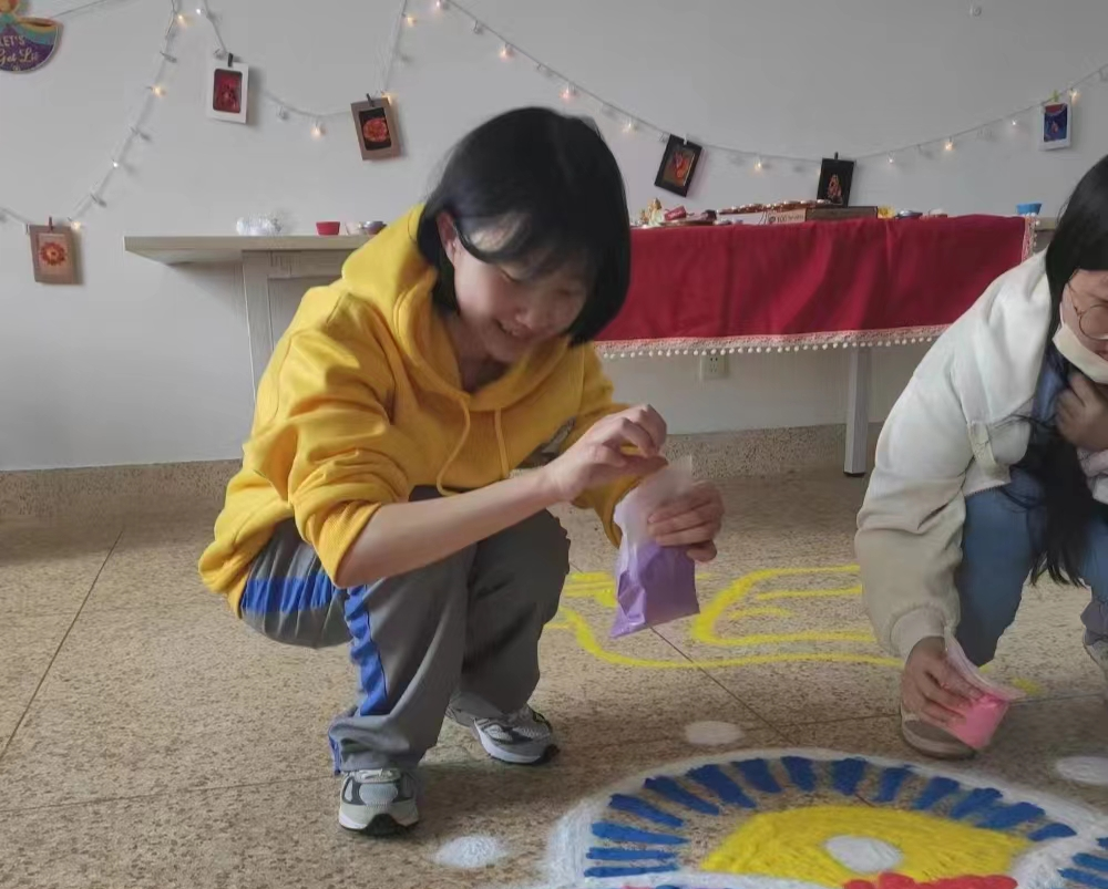此次排灯节体验活动由外教统筹安排。在外教Malavika Chakrabarty的指导下,学生们认真布置活动场所,他们移动桌子、在桌上铺上红色灯桌布,摆上象征智慧的象头神和财富女神拉克希米的雕像,挂上小灯,点上各种各样的蜡烛,并在地上用彩砂绘制了节日图案,完成节日场景布置。