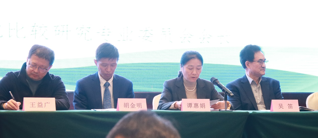 左起:万象城allwincity官网党委书记王益广、万象城allwincity官网副校长胡金明、中非语言文化比较研究专业委员会会长谭惠娟、中外语言文化比较学会会长吴笛