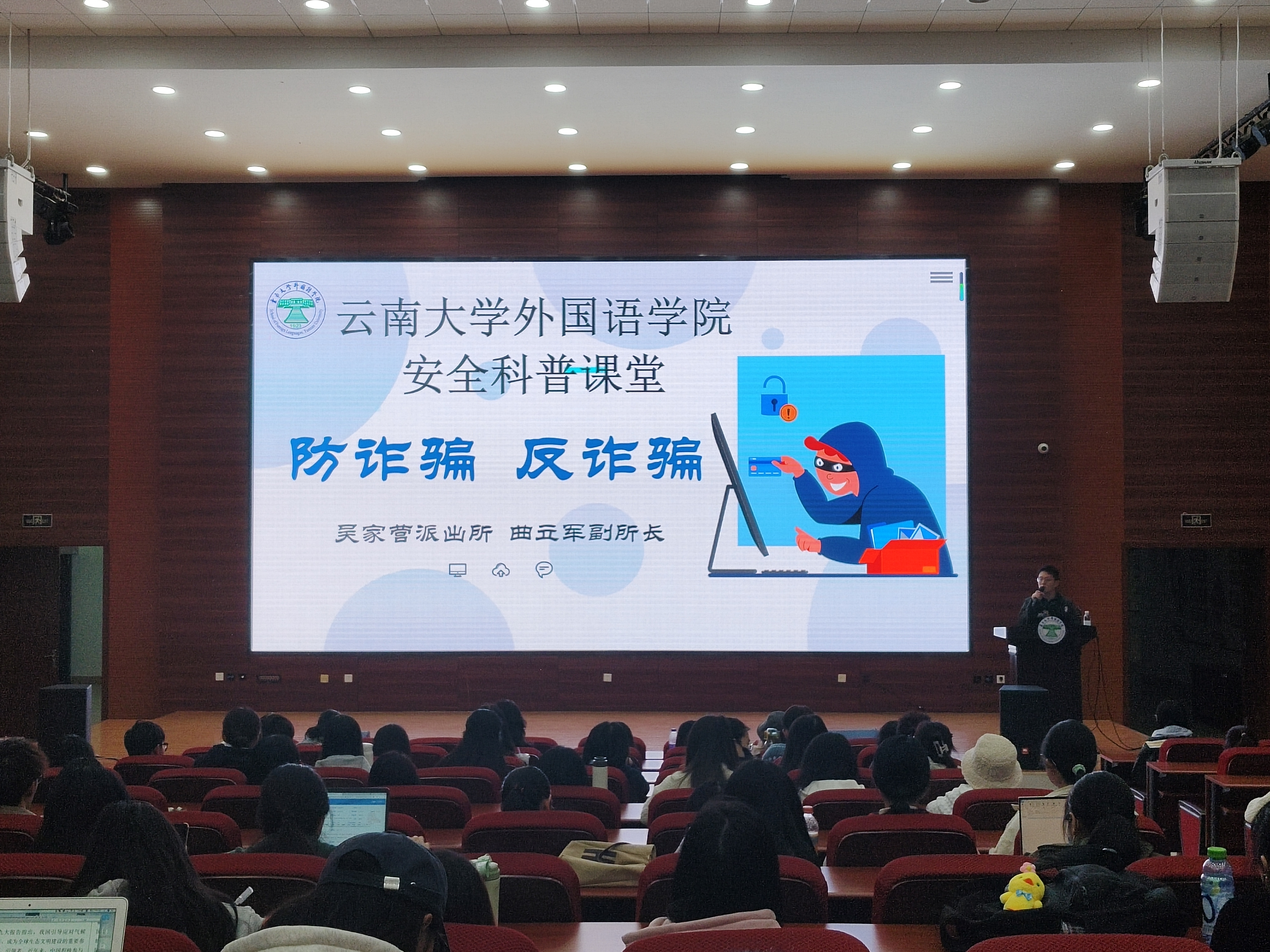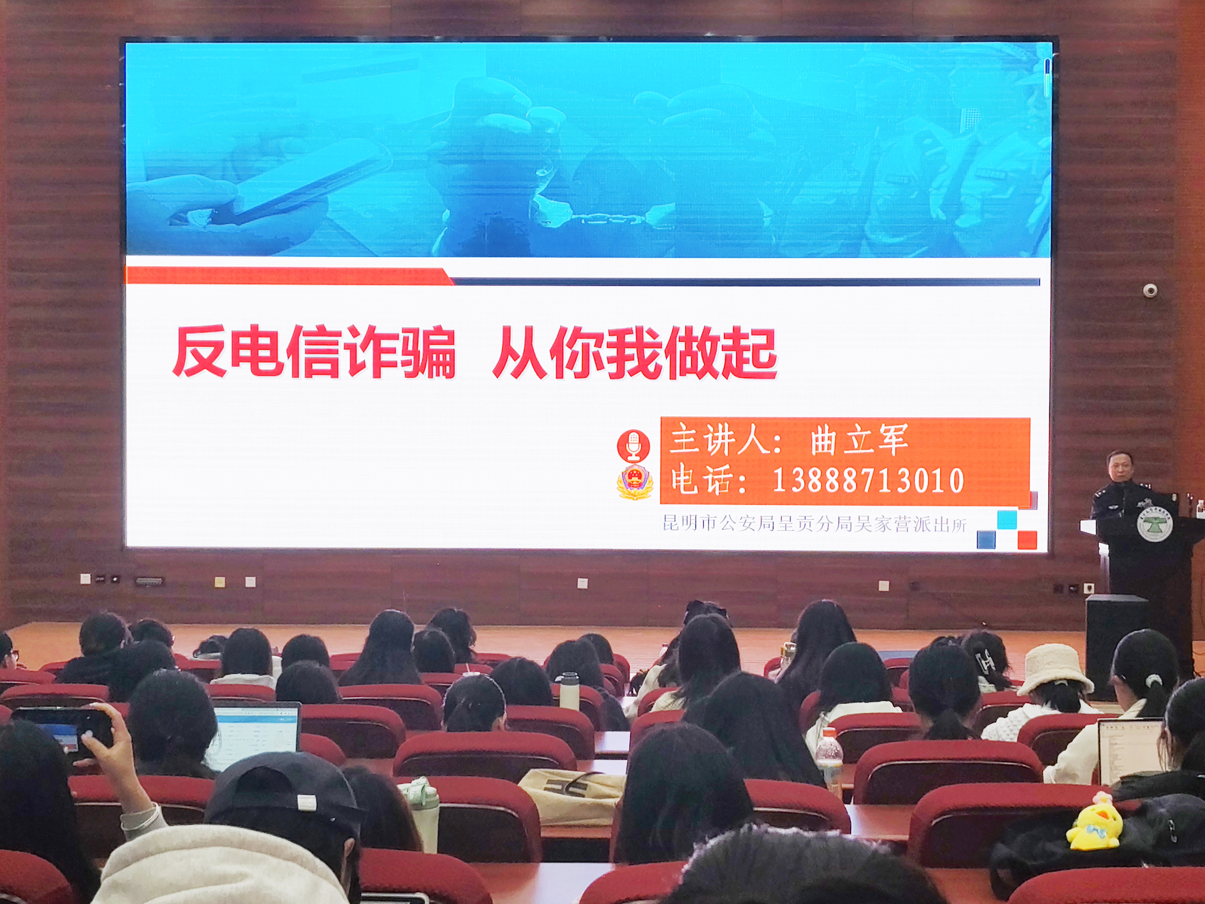 讲座围绕同学们应如何防范电信诈骗展开。曲立军所长首先向同学们科普了“什么是电信诈骗?”的相关知识,电信诈骗是指不法分子利用电话、网络和手机短信编造虚假信息设置骗局危害受害人利益的非接触性诈骗活动。在曲所长的专业讲解下,同学们都对电信诈骗有了更深刻的认识。为了让同学们警惕电信诈骗的危害,曲所长先是用数据分析罗列出近几年昆明市各高校被诈骗的人数,通过直观的表格分析,电信诈骗离我们并不遥远,时时刻刻都有可能发生在我们身边。曲所长还用身边的例子进一步“以案说法”,强调了电信诈骗对当代大学生的严重危害。那么,当我们遭受到电信诈骗时应该怎么办?曲所长给出补救措施:及时报警,牢记吴家营派出所快速止损号码!