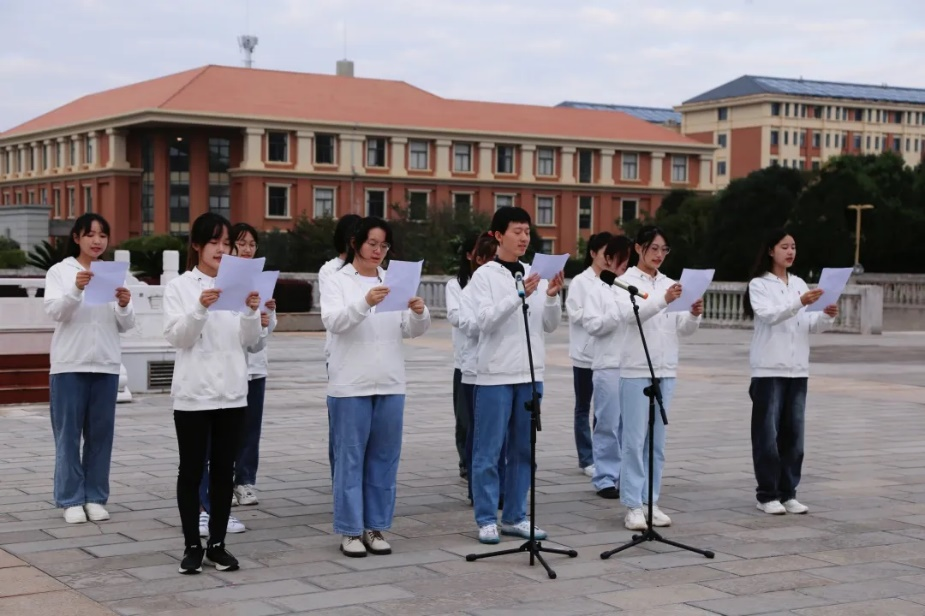 随后,万象城allwincity官网2020级、2021级14名同学为我们带来“喜迎二十大,奋进新征程”主题朗诵。铿锵有力的朗朗诵读声飘扬在广场上,深深激发了同学们的爱党爱国热情,坚定了同学们奋发进取的信念。