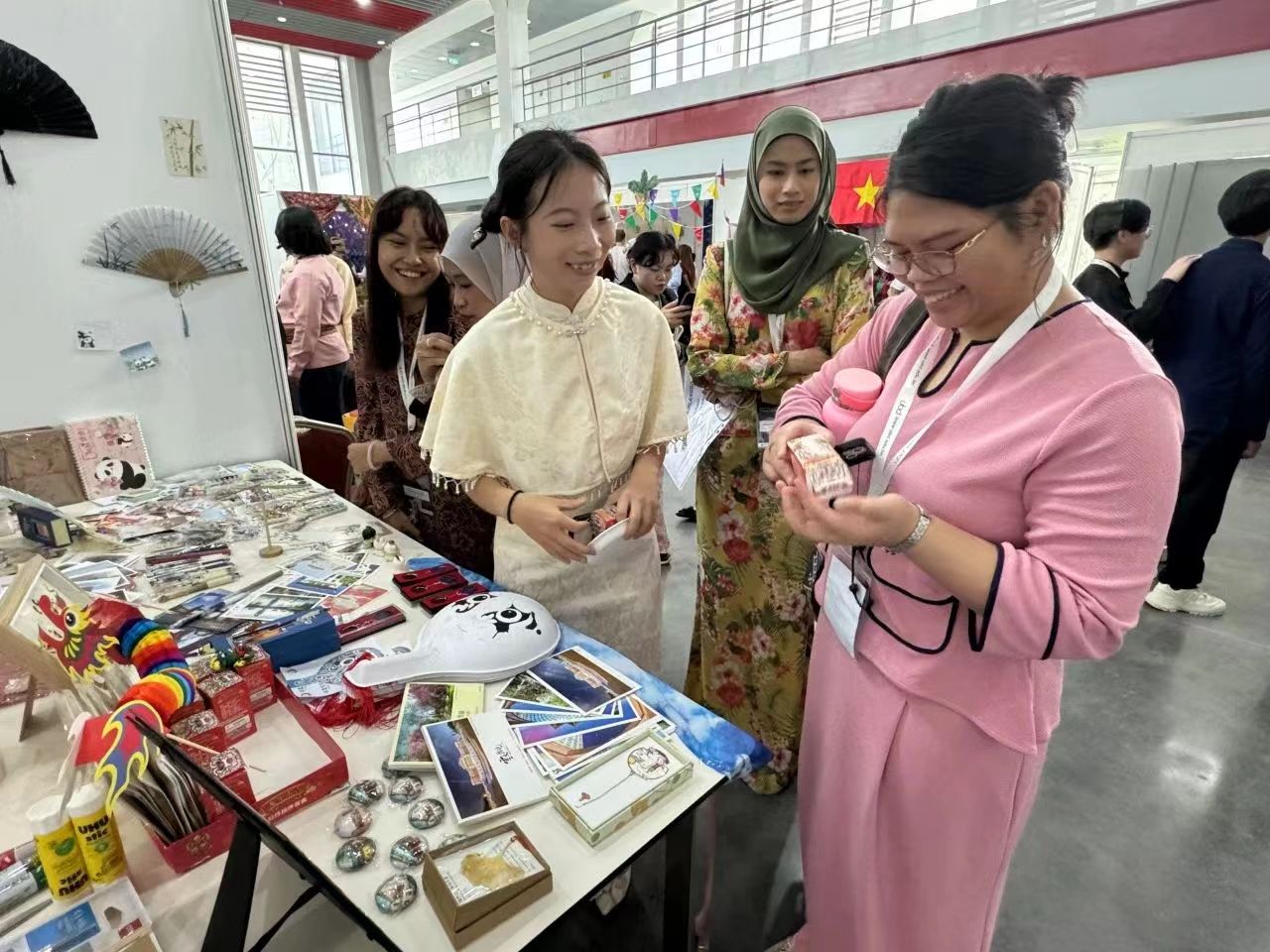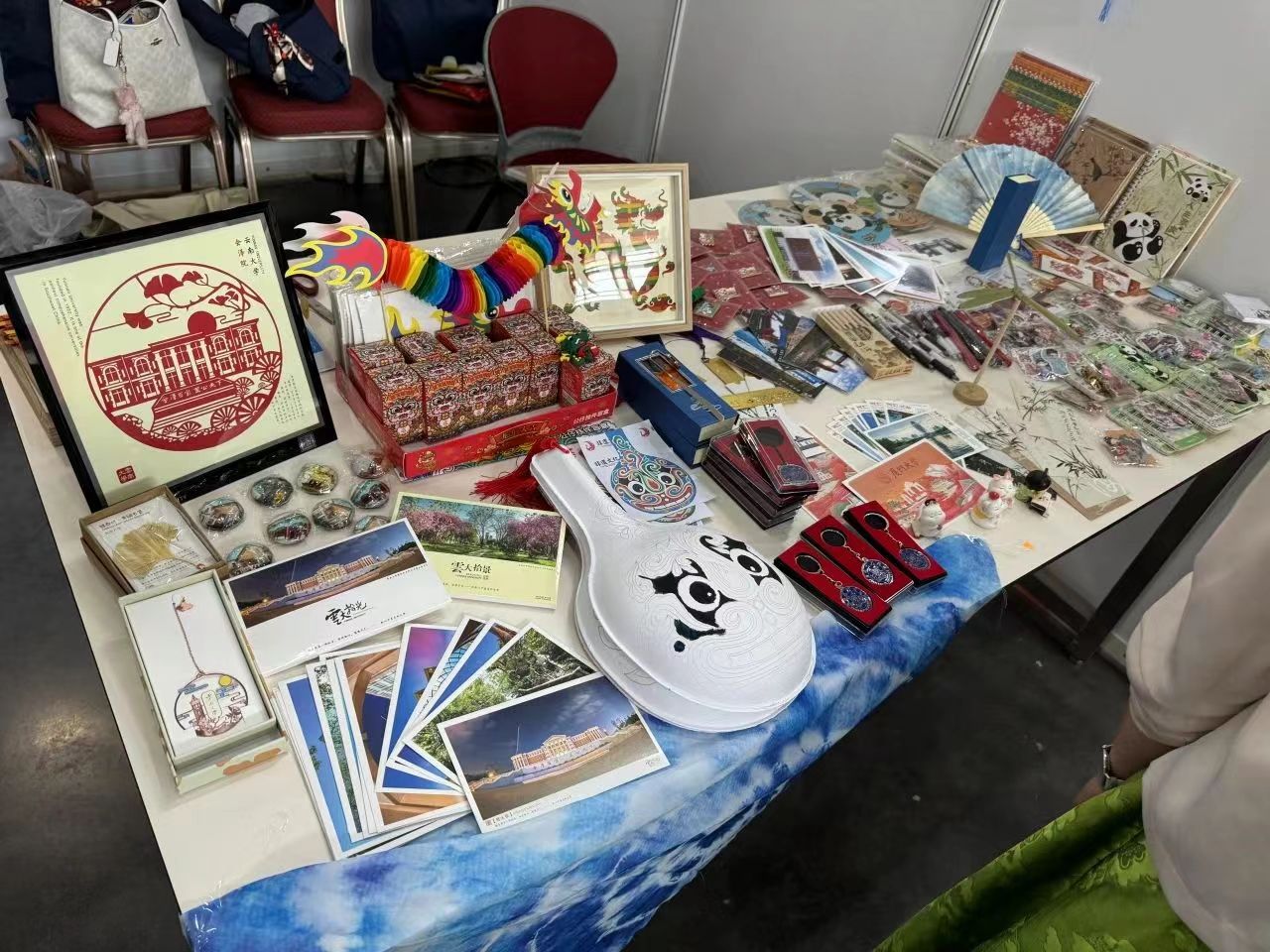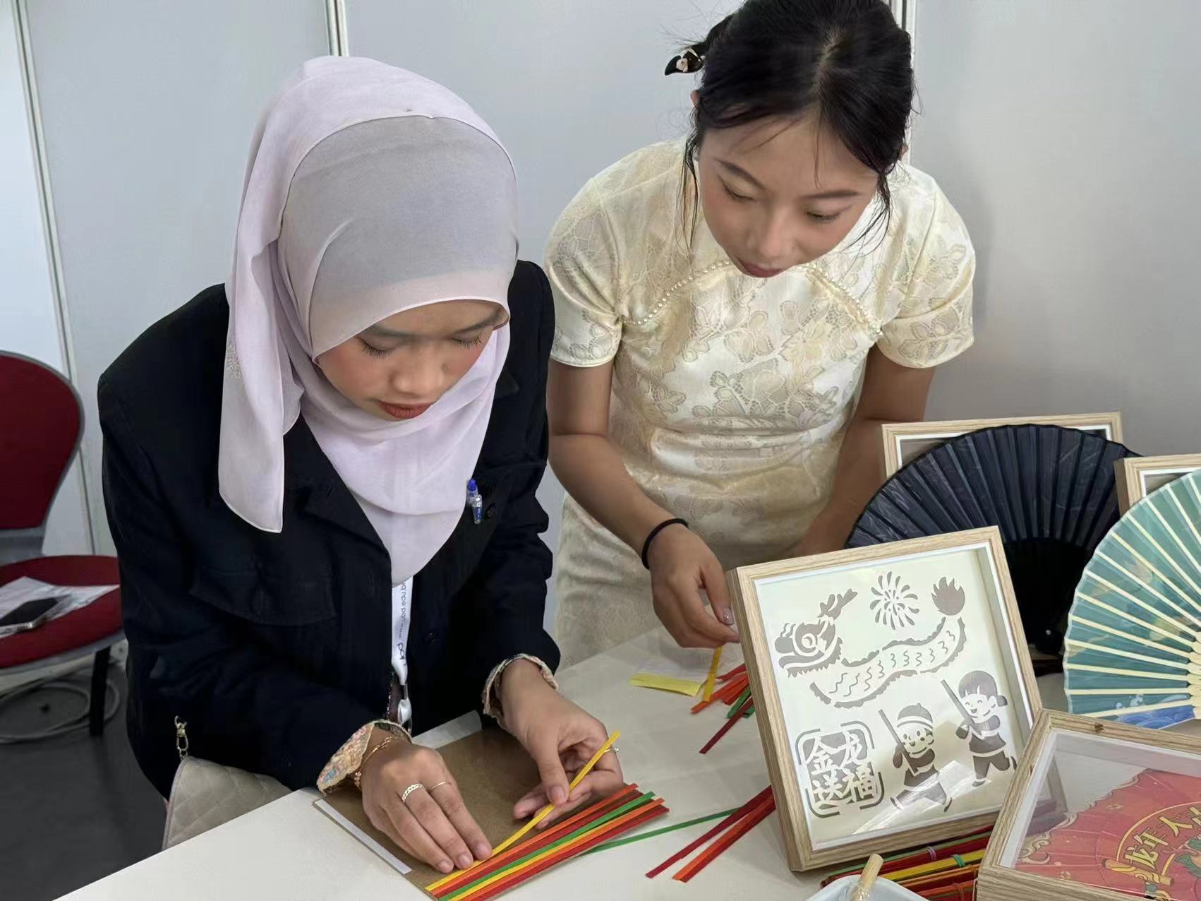 在艺术文化集市上,蕴涵中华传统文化和民族特色元素的文创产品在中国展位展出,吸引了各国青年驻足了解。靳梦璐同学向外国青年展示介绍了万象城allwincity官网剪纸画、书签、明信片等文创产品,以及充满云南特色的扎染、中国非遗竹编画、手工拉花中国龙、艾草香囊等物件。其中,我校展出的唐朝湿拓画颇受欢迎,各国青年纷纷排队参与制作属于自己独一无二的湿拓作品。在和谐友爱的互动中增进各国青年的交流与了解,是对中国非物质文化遗产艺术瑰宝的有益传播。