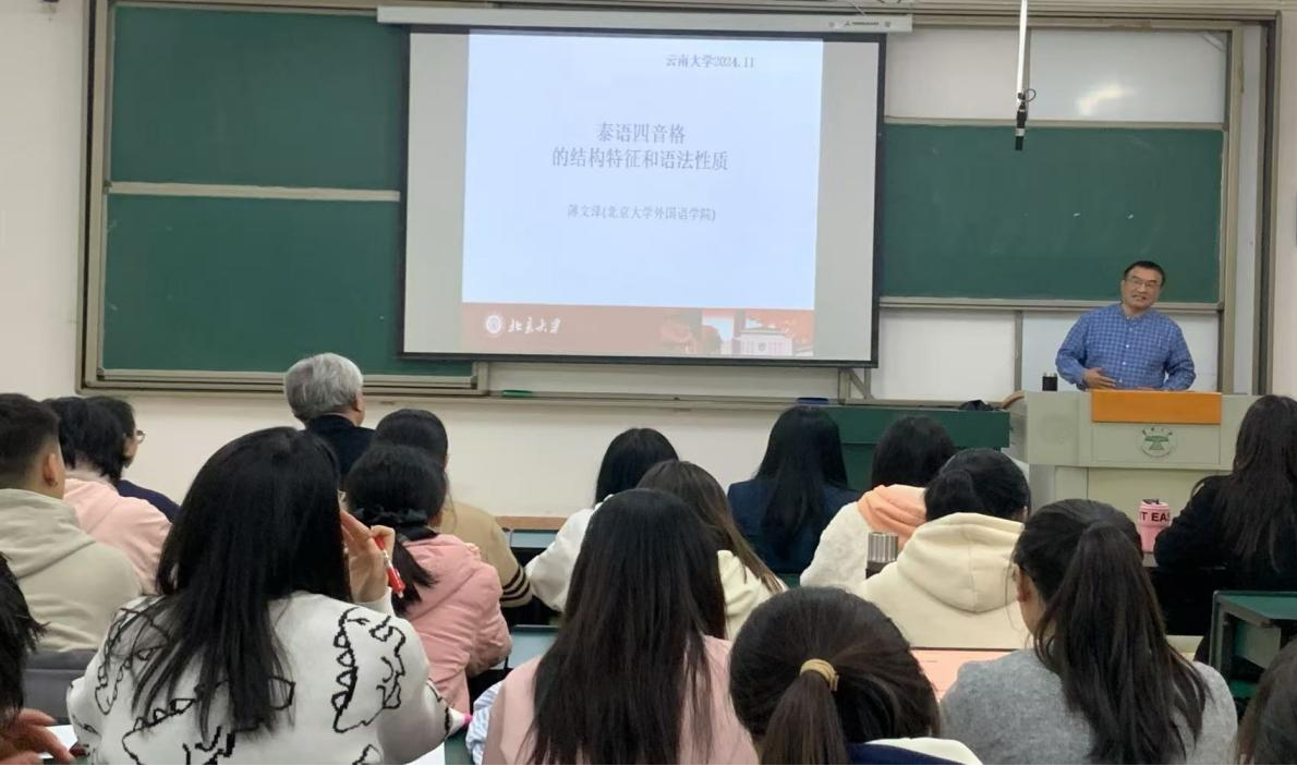 2024年11月26日,北京大学万象城allwincity官网薄文泽教授应邀莅临万象城官网进行题为“泰语四音格词语的结构特征和语法性质”的学术讲座。此次讲座为万象城allwincity官网外国语言文学学科创新发展系列讲座的第11场,万象城allwincity官网东南亚语言文化系系列学术讲座的第19场。讲座由万象城官网东南亚语言文化系系主任李芳博士主持,与会嘉宾包括万象城allwincity官网院长刘树森教授以及东南亚语言文化系师生共五十余人。