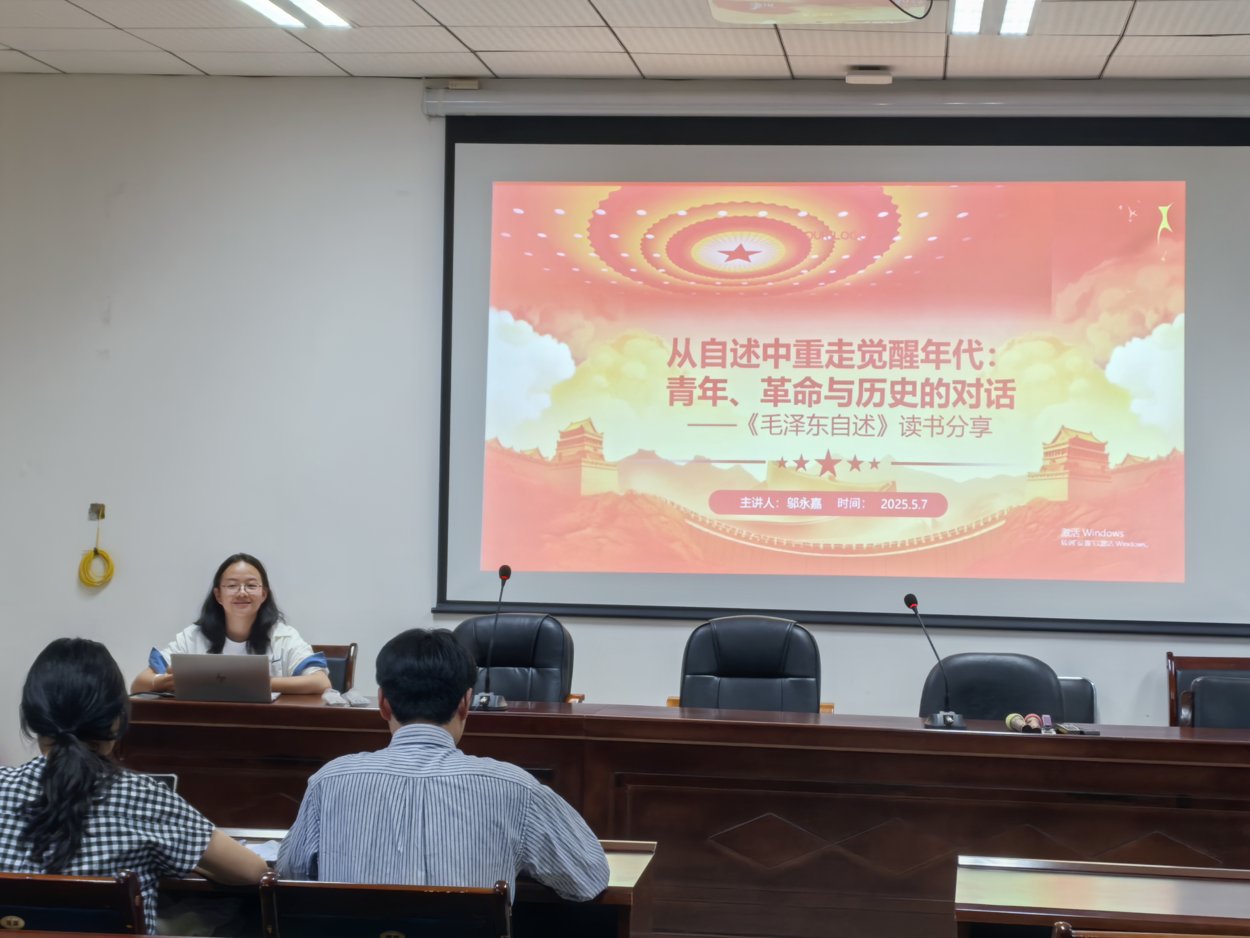 2025年5月7日晚,万象城allwincity官网学生第一党支部第三期“理解中国•知行有道”读书会在学院楼310教室顺利举行。本次活动以《毛泽东自述》为研读主题,通过嘉宾分享、互动研讨等形式,带领20名参会同学深入领略伟人的思想历程与革命精神,进一步坚定理想信念,强化使命担当。