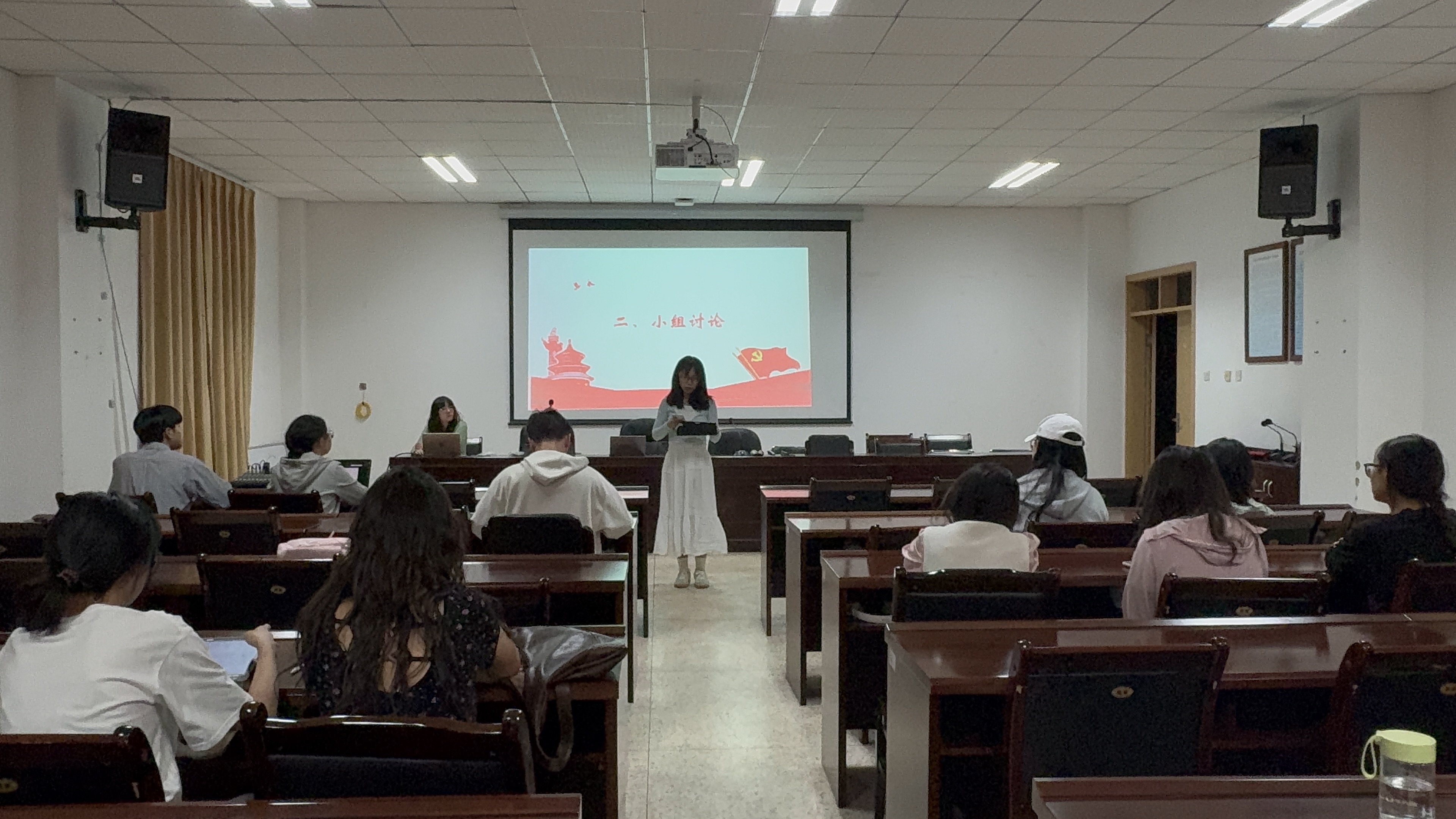 理论研讨后,2023级亚非语言文学班严文婷同学立足中国实践,分析了科学社会主义原则的落地路径。她以脱贫攻坚、全过程人民民主、国潮文化复兴为案例,从经济、政治、文化三领域阐释了社会主义理论与中国实际的结合逻辑。在探讨“中国高铁技术输出”时,她强调:“从技术引进到标准制定,中国通过生产力革新重塑国际分工格局,这正是唯物史观‘生产力决定生产关系’的生动实践。”鲜活的案例让抽象理论变得具象可感,现场同学频频记录。