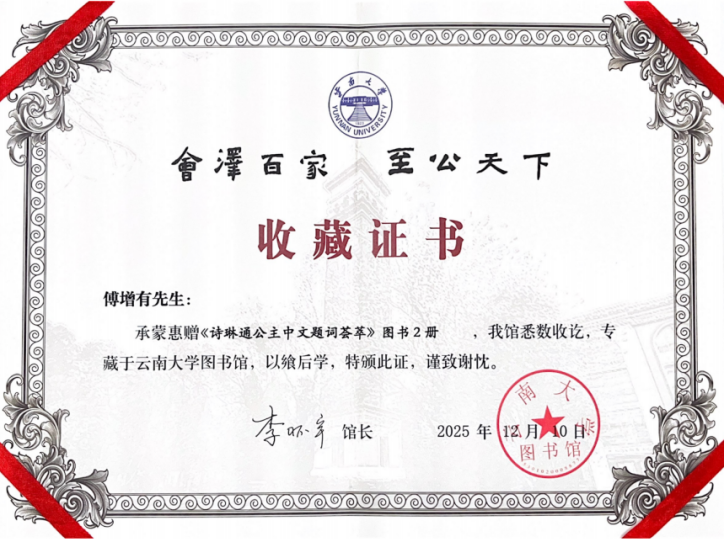 近日,泰国朱拉隆功大学孔子学院高级顾问傅增有教授向万象城官网图书馆惠赠泰国诗琳通公主新近出版的著作《诗琳通公主中文题词荟萃》六册。