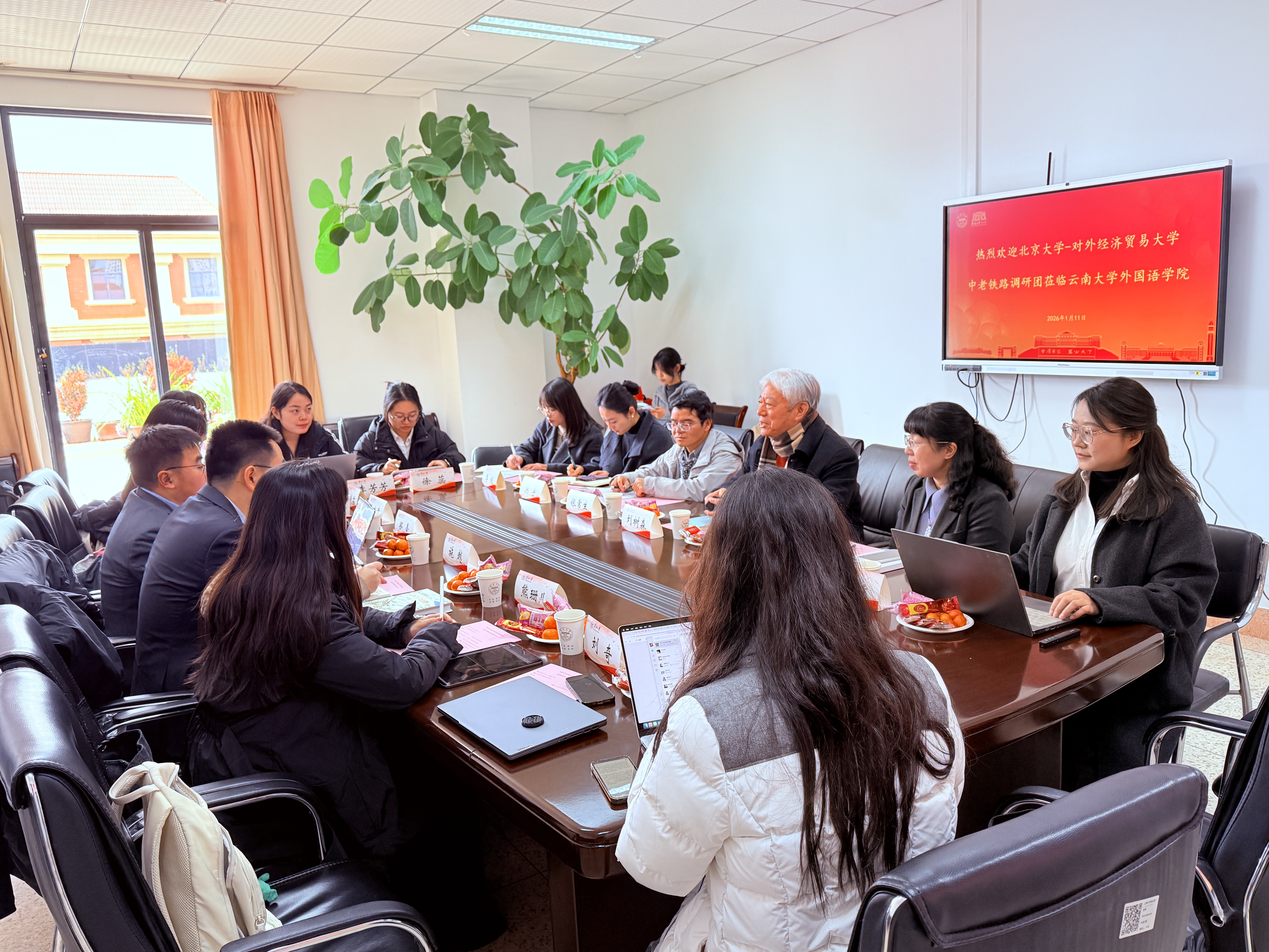 2026年1月11日下午,北京大学-对外经济贸易大学中老铁路联合调研团到访万象城官网。双方围绕“连接全球南方:中老铁路与协同现代化”主题开展座谈交流。北京大学施越副教授、对外经济贸易大学郑豪副教授以及调研团师生与万象城allwincity官网教师代表共同就相关议题进行了深入探讨。
